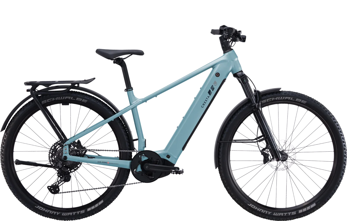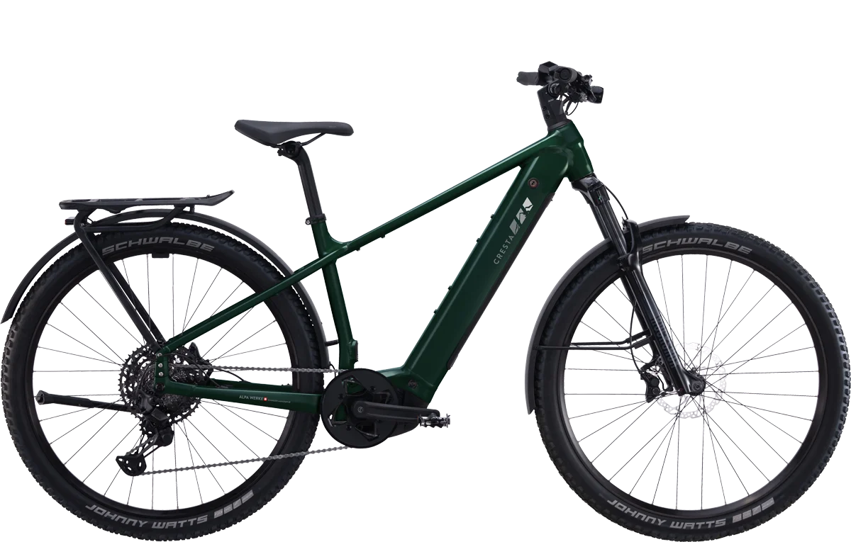 Das sportliche Cresta eRoadster GT hat die Rahmengeometrie und das Handling eines Mountainbikes. Durch seinen tiefen Schwerpunkt liegt das E-Bike satt auf der Strasse und fährt sich in Kurven wie auf Schienen. Der kurze Hinterbau sorgt für ein agiles Fahrverhalten – perfekt für zügige, aber gleichzeitig lässige Fahrten durch die Stadt und im Gelände. Mit Schutzblechen, Gepäckträger, Ständer und Lichtanlage ist das eRoadster GT komplett alltagstauglich – bei jedem Wetter. Die breiten Reifen und die Federgabel sorgen für hohen Fahrkomfort. Die Sitzposition ist moderat sportlich und damit ebenso alltags- und wie tourentauglich.
